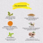 - Ingredients: Withania Somnifera (Ashwagandha) 150mg, Cicer Arietinum (Chhola) (450mg.), Ervum Lens (Massor) (450mg.), Oriza Sativum (Rice) (450mg.), Hordeum Vulgare (Jau) (450mg.), Ttriticum Aestivum (Wheat) (450mg.), Glycyrrhiza Glabra (Mulethi) (250mg.), Ocimum Sanctum (Tulsi) (200mg.), Hemidesmus Indicus (Anantamul) (175mg , Trigoneila Foemumgraecum (Methi) (150mg.), Piper Longum (Pipul) (150mg.), Azadirachta Indica (Neem) (150mg.), Rubia Cordifolia (Manjistha) (150mg.), Cynodon Dactylon (Durva) (150mg.), Citrus Aurantium (Orange) (150mg.), Citrus Limonum (Lemon) (150mg.), Foeniculum Vulgare (Mouri) (100mg.), Tribulus Terrestis (Goksura) (100mg.), Myristica Fragrans (Jaiphal) (100mg.), Mesua Ferrea (Nagkesar) (100mg.), Ipomoea Digitata (Bhumikushmandu) (100mg.), Asparagus Racemosus (Satavari) (100mg.), Caesalpinia Sappan (Patang) (100mg.) Cinnamomum Camphora (Camphor) (150mg.), Oil Of Prunus Dulcis (Almond Oil) (0.1ml.), Vitamin E – Oil (0.1ml.), Oil Of Cinnamomum Zeylanicum (Cinnamon Oil) (0.015ml.) Sodium Benzoate (25mg.) Carrot Seed Oil (0.1ml.), Geranium Oil (0.015ml.), Sandal Wood Oil (0.015ml.), Lavender Oil (0.015ml.) Composition.