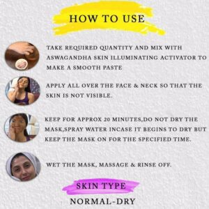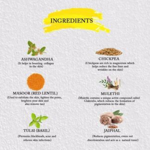 - COMBINATION – To provide extraordinary fairness, smoothness and glow, this ashwagandha skin illuminating face ubtan is specially formulated by combining unique natural moisturizers along with selected ayurvedic herbs