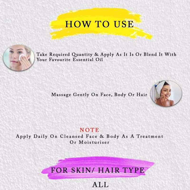 | METHOD OF APPLICATION | Apply daily on cleansed face & body as a treatment or moisturizer. Take the required quantity & apply as it is or blend it with your favorite essential oil. Massage gently on the face, body, or hair. |