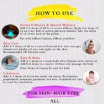 METHOD OF APPLICATION 2-4 drops blend in 5ml of your favorite carrier oil for skin/hair application. 6-8 drops in bathtub/bucket. 8-10 drops in 100ml water for aroma diffuser.